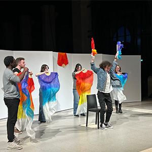 Rencontrer régulièrement des publics variés est une chance rare ancrée au cœur du processus de création de la Cie Supernovae. Au cours de 5 séances de travail, ce groupe d’étudiants a exploré diverses facettes du jeu théâtral : les jeux et transferts de statuts, les expérimentations vers un imaginaire toujours en mouvement, y compris par l’écriture, ou encore l’écoute instinctive du groupe. À travers une série d’exercices la notion de révolte s’est vite invitée comme une évidence et comme un axe : « re volta » – faire volte-face, se tourner, refuser, accompagné de près par le perpétuel recommencement de la révolution.